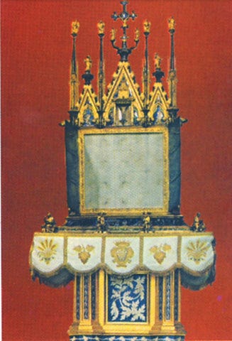 IN BOLSENA - The pieces of marble on which the blood spilled were taken up from the floor of the altar, and placed into reliquaries. There are four stones, each showing the blood of the Sacred Host. Three of them were placed in a special Altar, called the Altar of the Miracle, in the Church of Bolsena. The fourth one was placed in a special reliquary, which was built later on. It was placed on the wall behind the original altar of St. Christina, where the miracle took place. Each year, on the feast of the Miracle, this reliquary is carried through the town in solemn procession.